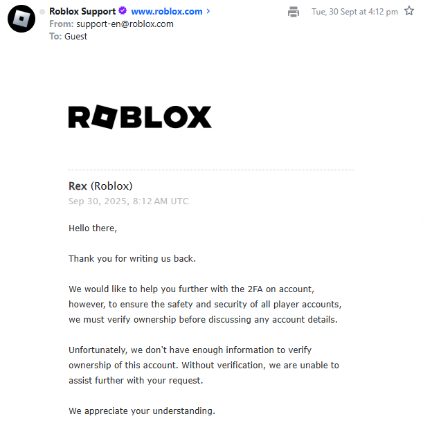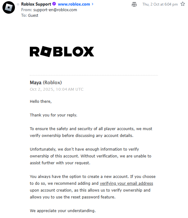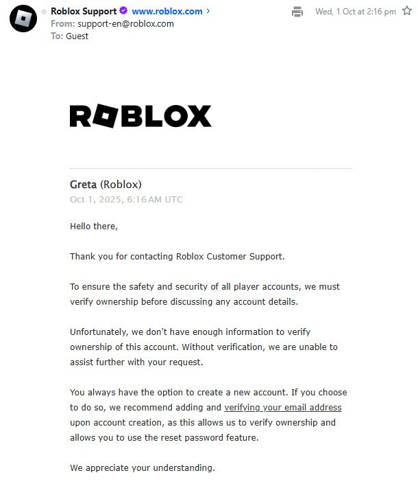 What happens: Roblox support says they don’t have enough information to verify ownership of this account.